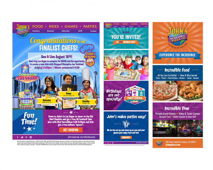 With locations stretching from Orange County to Las Vegas John's Incredible Pizza has more than 10 locations, and design assignments were produced with tight corporate standards to keep unity across all touchpoints.